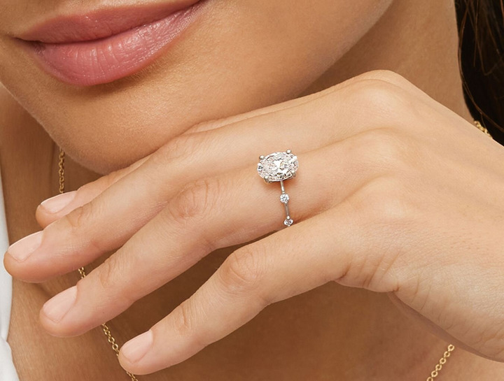 Inviting bold variations in size and shape to create striking visual interest, next year’s proportion-based trend is all about finding a balanced silhouette—and is beautifully exemplified by rings featuring elongated center stones. To enhance the overall silhouette and draw the eye, elongated center stones play with proportion to create a captivating statement piece. Cuts including oval, emerald, marquise, and elongated cushions are highly sought-after for 2025. “These shapes give the illusion of longer, slimmer fingers, which adds elegance,” says Chen. Elongated stones also offer a larger surface area for light to reflect, making them appear larger and more brilliant than traditional round cuts of the same carat weight. The trend of elongated center stones appeals to those who want a classic yet sophisticated look with a modern twist.