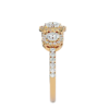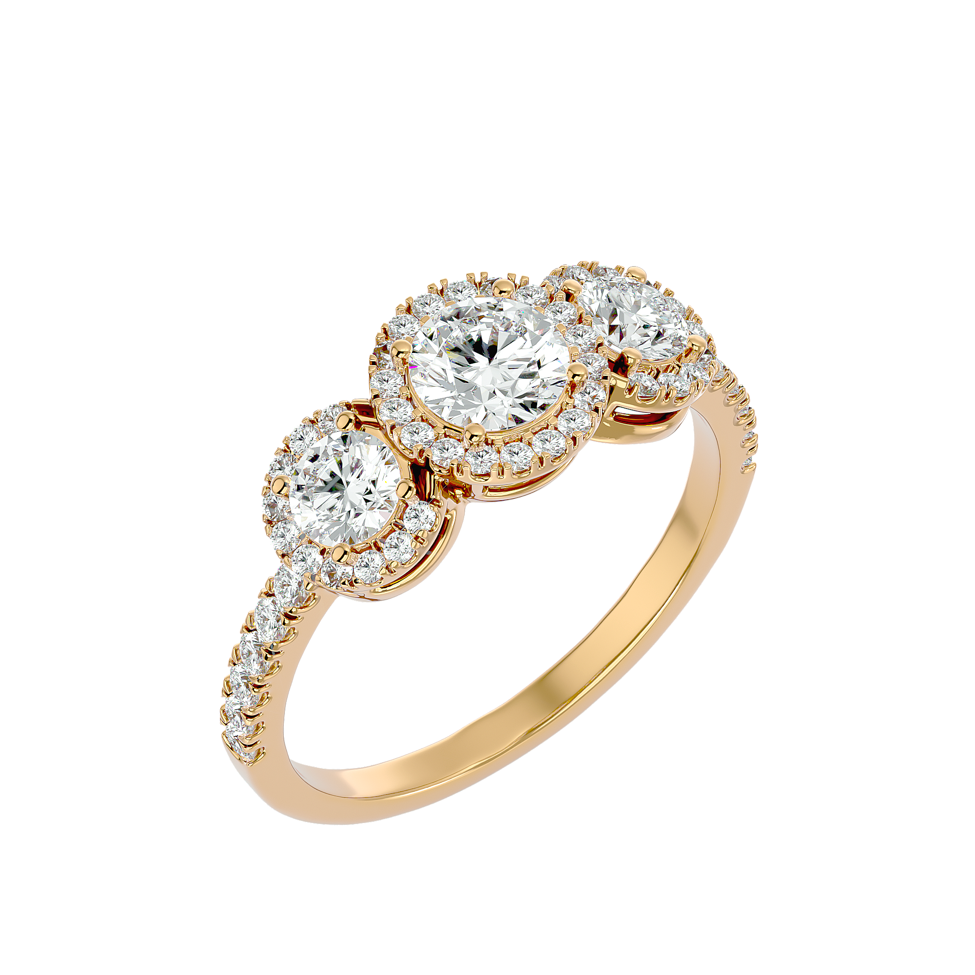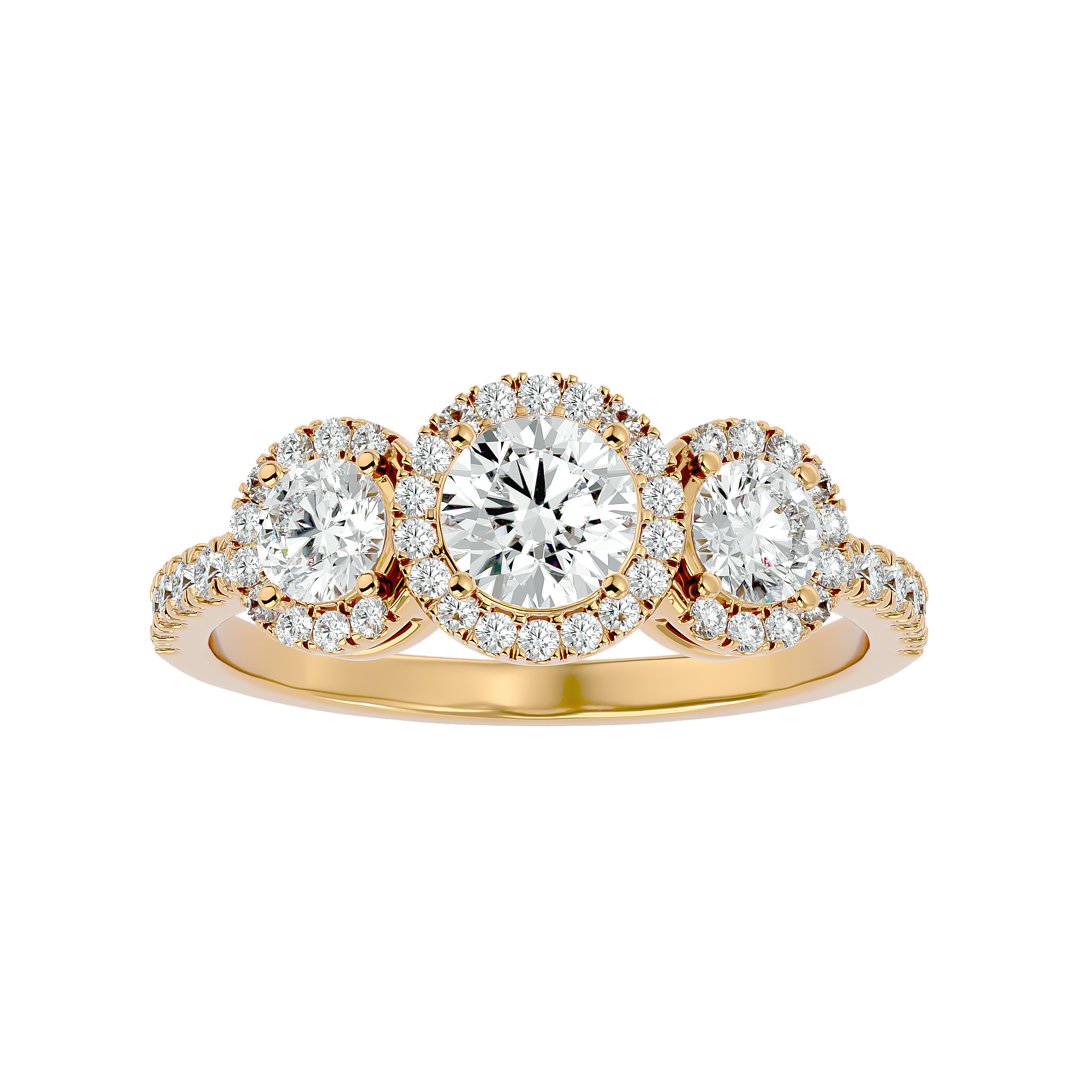 Shine with elegance in this breathtaking 18K gold ring, featuring a trio of dazzling lab-grown diamonds surrounded by a shimmering halo. Designed for sophistication and brilliance, this piece is perfect for engagements, anniversaries, or any special moment.